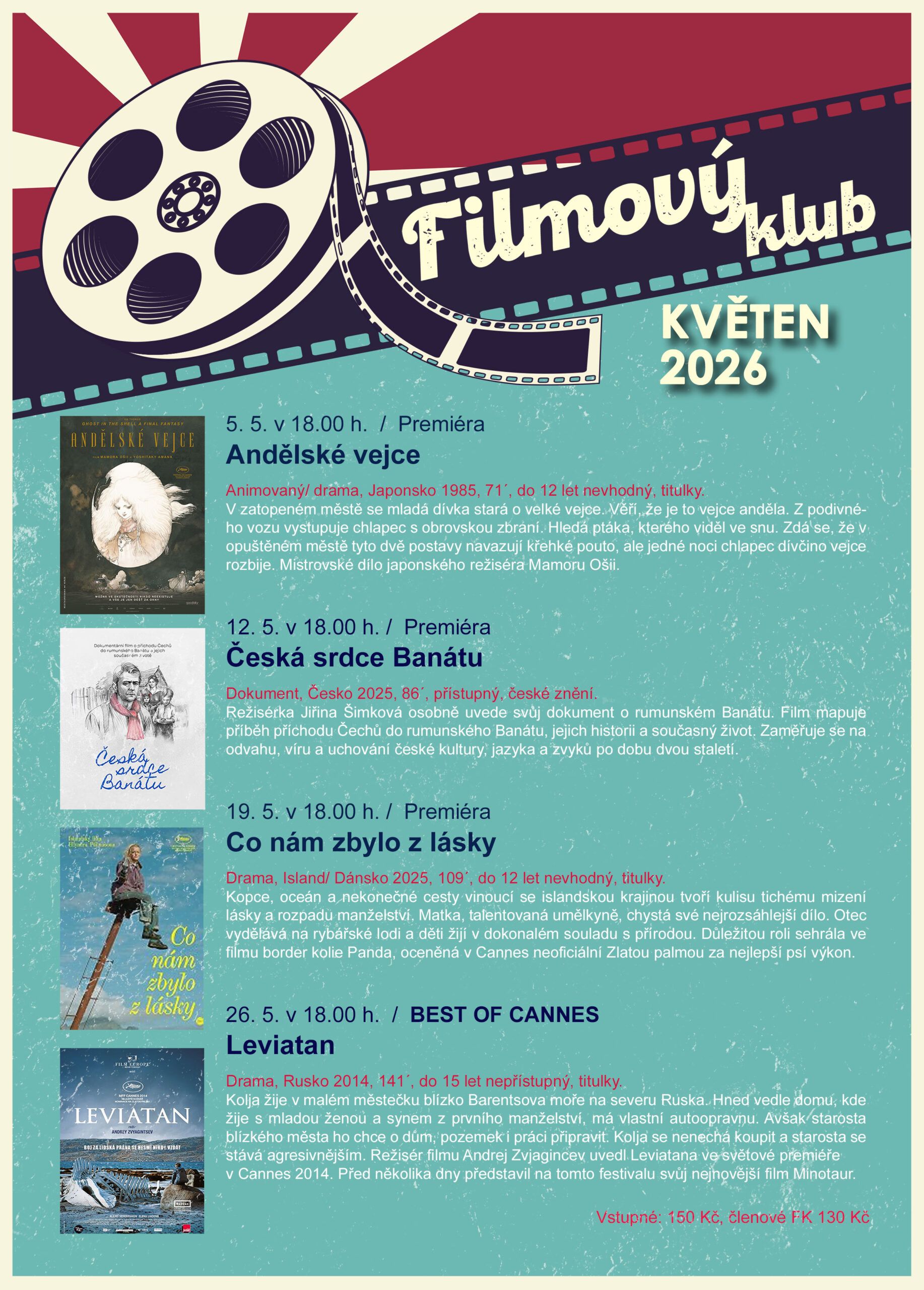 V květnu Vás čeká pestrý výběr filmů, které byste si rozhodně neměli nechat ujít! Na filmovém plátně se objeví snímky jako Andělské vejce, Česká srdce Banátu, Co nám zbylo z lásky nebo Leviatan. Pro členy Filmového klubu je navíc vstupné na všechny tyto snímky za zvýhodněnou cenu 130 Kč. Vstupenky jsou k zakoupení již nyní on-line a také v pokladně Kina Centrum a KD Petra Bezruče.
