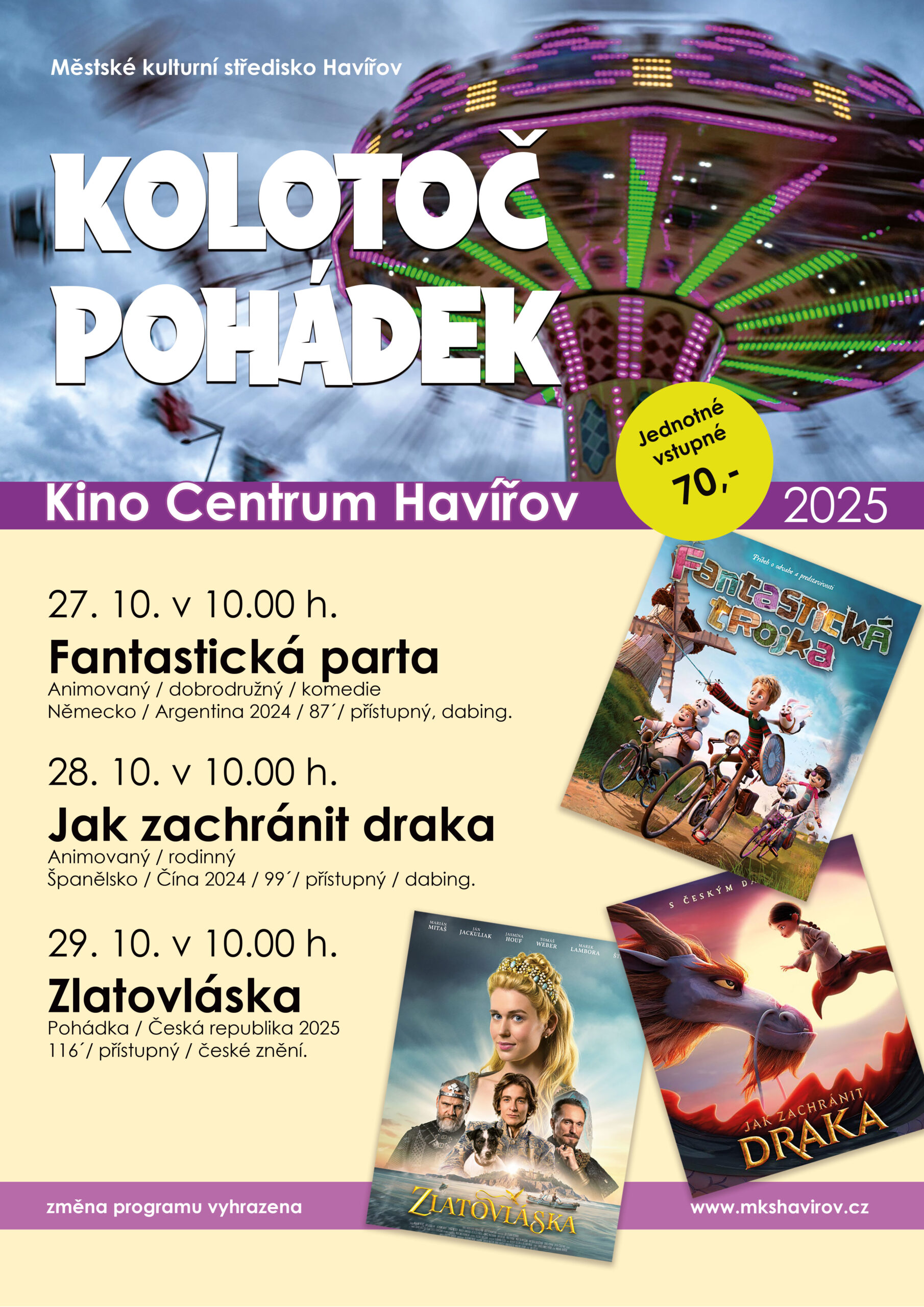 KOLOTOČ POHÁDEK KOLOTOČ POHÁDEK Koupit vstupenku 27.10. | 10:00 Fantastická parta Koupit vstupenku 28.10. | 10:00 Jak zachránit draka Koupit vstupenku 29.10. | 10:00 Zlatovláska