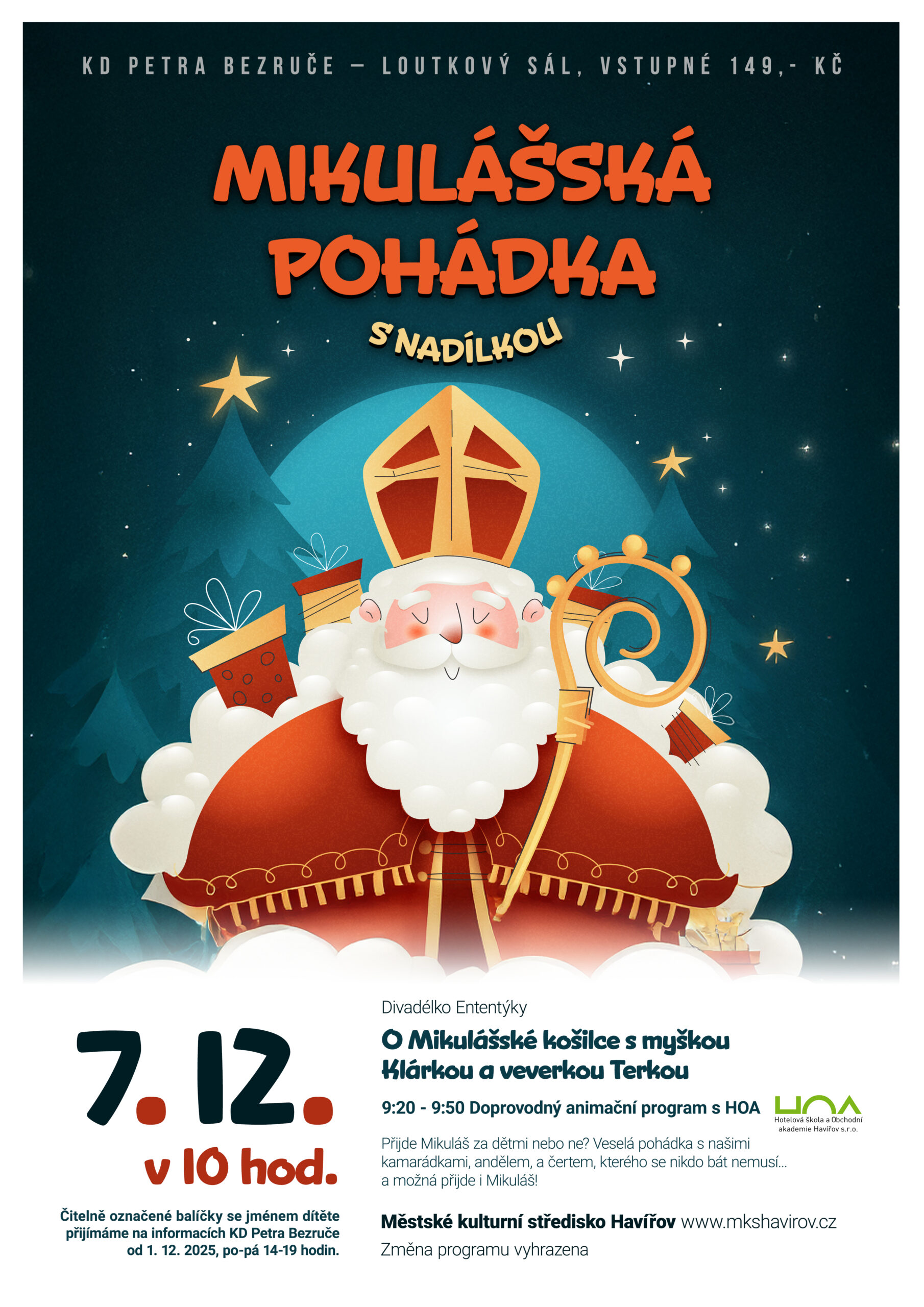 Čitelně označené balíčky se jménem dítěte přijímáme na informacích KD Petra Bezruče od pondělí 1. 12. 2025,
